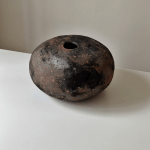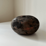 Hand-built using traditional coiling techniques, this vessel mimics the raw, grounding presence of river stones found in nature. The surface is left unglazed to highlight the tactile grit and "burnt" reddish-black hues of the stoneware, created through a reduction firing process. A celebration of primitive beauty and the quiet strength of the earth.