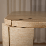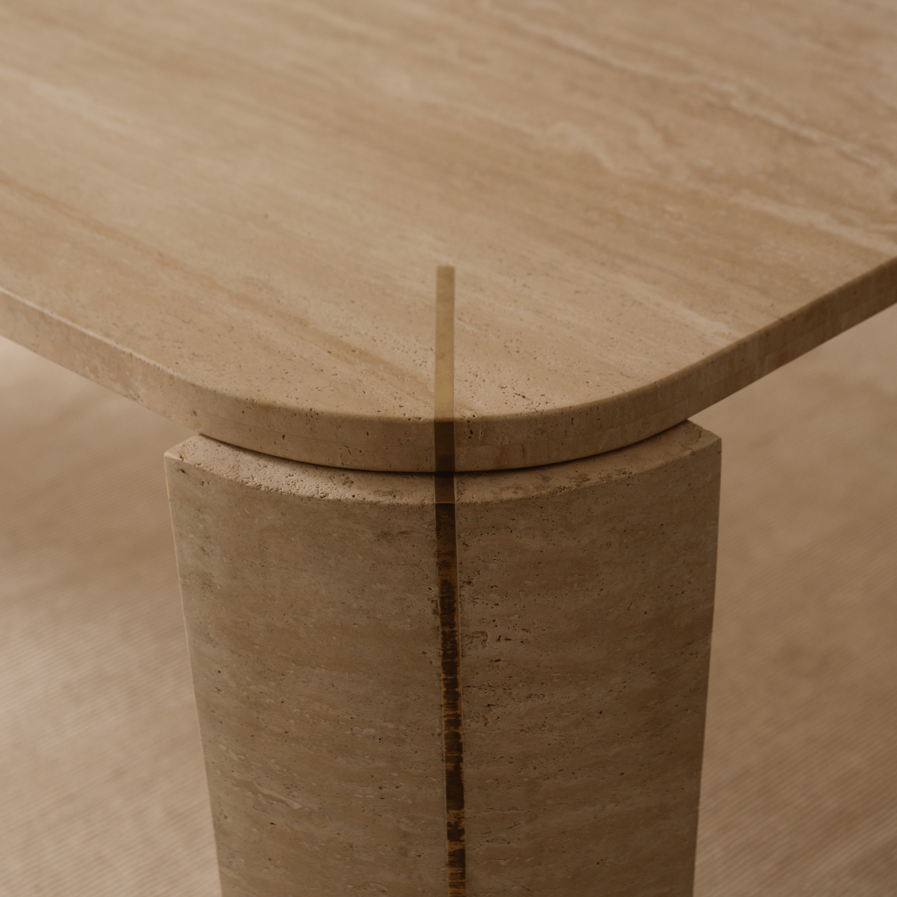 Sculptural Travertine & Brass Dining Table This dining table serves as a stunning example of organic modern design, combining the raw beauty of natural stone with refined metallic detailing. The table features a substantial rectangular top with soft, rounded corners, resting on four thick, curved column legs that give the piece a monumental yet graceful presence. Its defining feature is a continuous brass insert strip that runs vertically up the center of each leg and extends seamlessly onto the table surface, creating a sophisticated linear accent that visually connects the base to the top. The design highlights the contrast between the earthy, porous texture of the stone and the sleek, precise line of the metal.