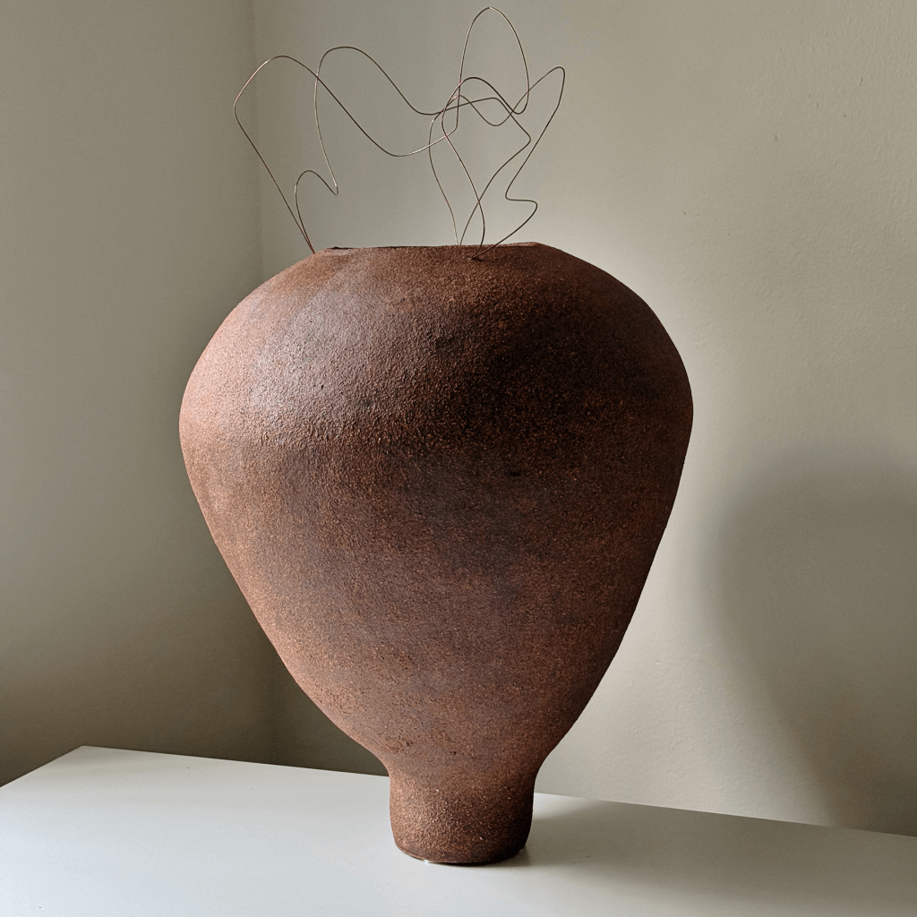 Part of the Mixed Media series, this large sculptural vessel explores the dialogue between soft, malleable clay and rigid industrial wire. Built slowly by hand from rough terracotta stoneware, the body features a deeply textured, crater-like surface that contrasts with the delicate, chaotic movement of the wire rising from the rim—a fusion of ancient craft and modern tension.
