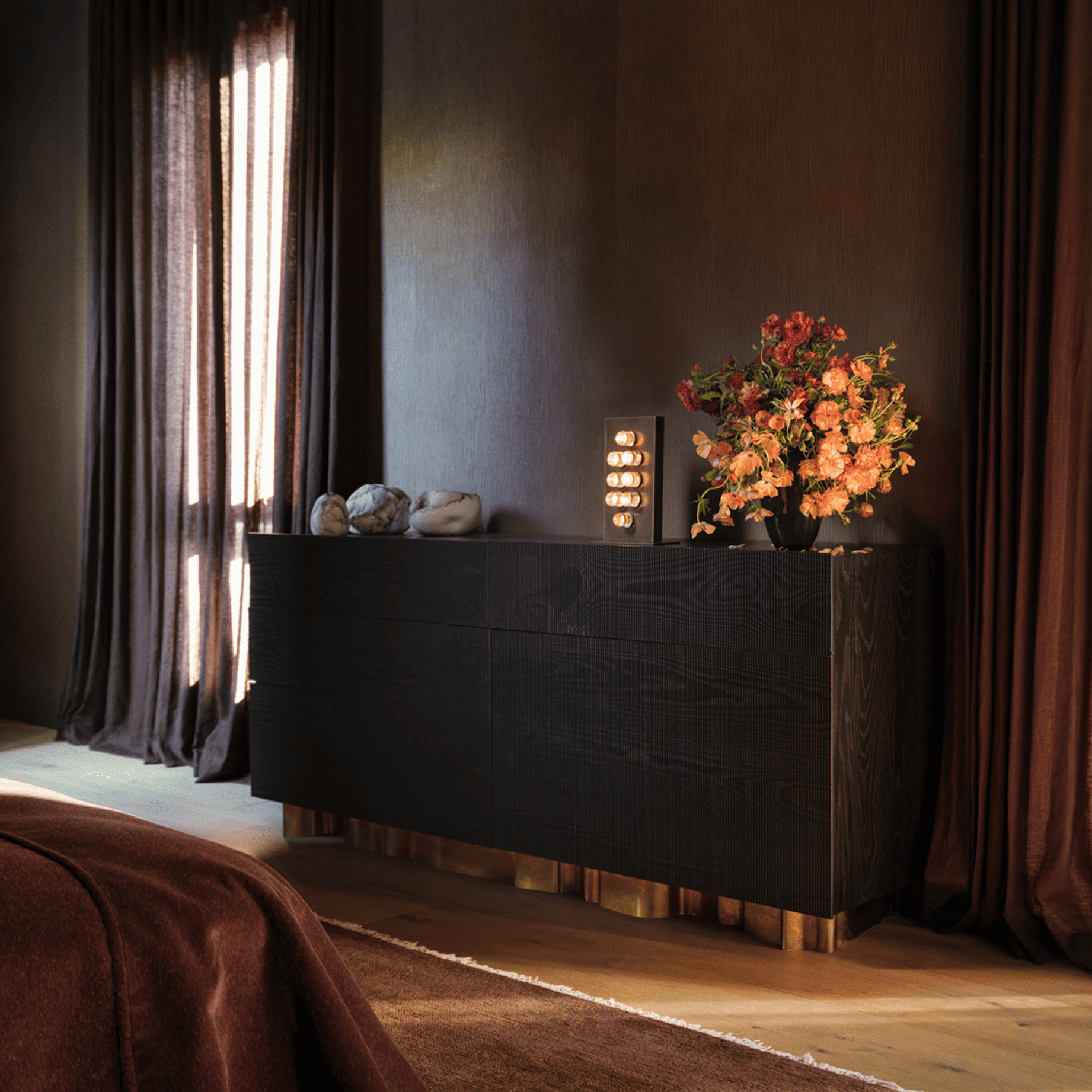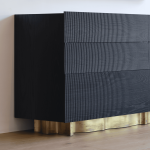 Nami Credenza Designer: Huma Sulaiman The Nami Credenza is a statement piece that masterfully contrasts rigid architectural lines with organic fluidity. It features a sleek, rectangular body with sophisticated linear texturing, perched atop a sculptural, wave-like metal base that mimics the motion of the ocean. The design creates a dramatic interplay of light and shadow, blending modern minimalism with artistic flair.