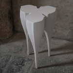 Nuria Coffee Table Created by French artist Nadège Mouyssinat, the Nuria table is a surrealist exploration of balance and organic form. Hand-sculpted in her Limoges studio, the piece features three tapered, root-like legs that merge seamlessly into a fluid, tri-lobed surface. The design draws inspiration from vegetal growth and "protective femininity," resulting in a silhouette that feels both ancient and futuristic. Its seamless, monolithic structure gives the impression of a living object paused in motion, embodying the artist's signature fusion of technical precision and sensual, biological curves.