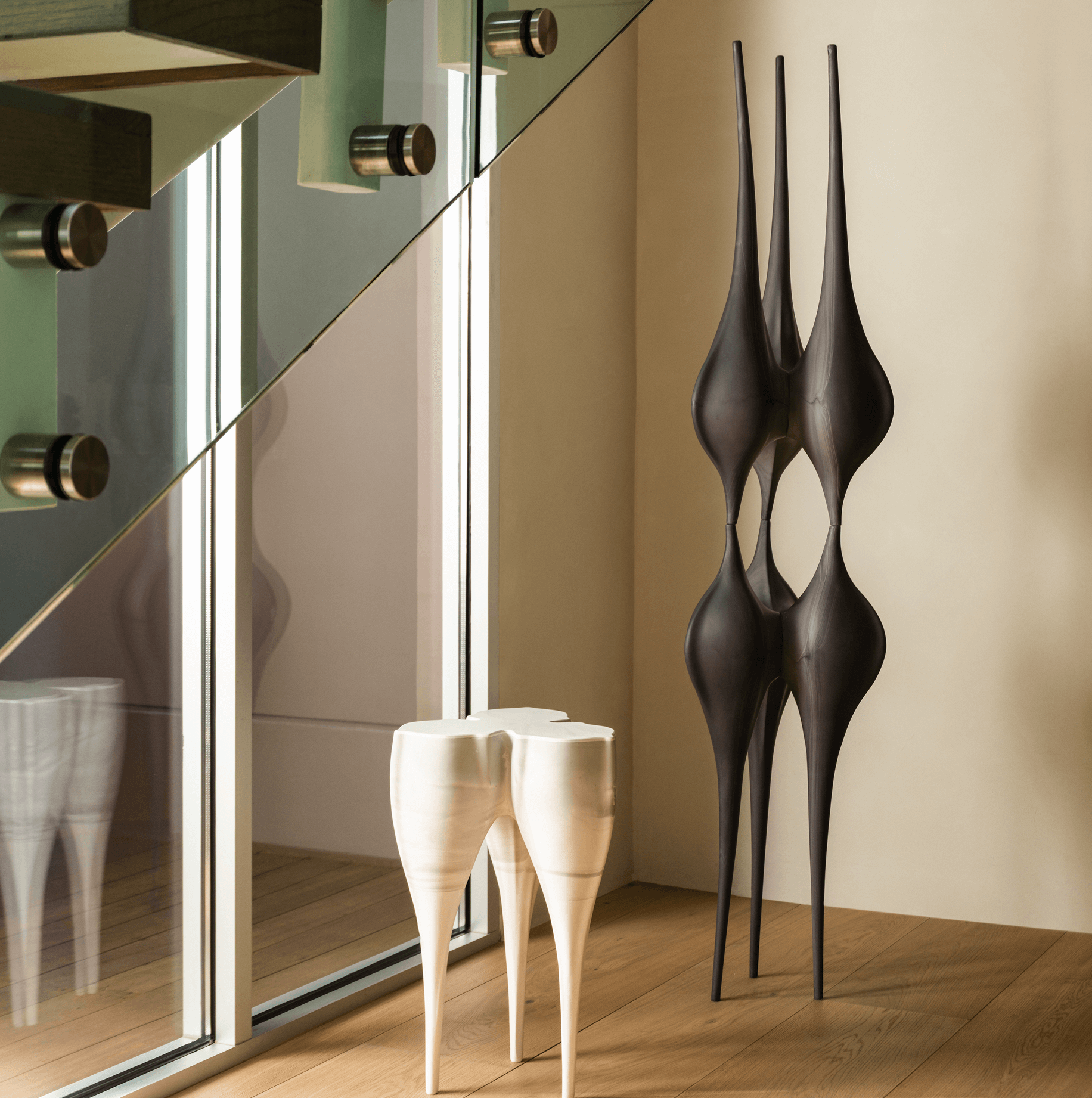 The result of extensive research carried out in Nadege’s studio, this deep shade is born from a precise blend of metallic oxides incorporated directly into the porcelain. A patient hand-building process gives rise to these soft, elongated, organic curves. The surface is refined through multiple successive sandings, giving it the satin-smooth, mineral texture characteristic of the piece. During firing, the pigments move unpredictably and settle into subtle, unique landscape-like patterns. The entire structure is reinforced by internal metal rods, and threaded inserts integrated beneath the feet allow the piece to be fixed if desired.