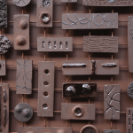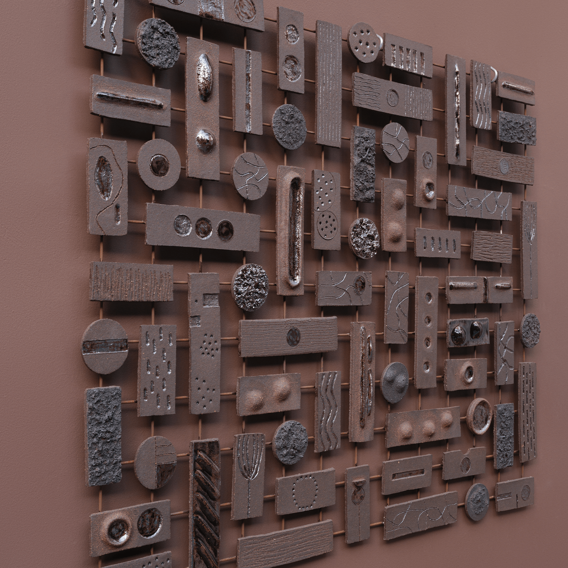 A rhythmic composition of hand-built ceramic fragments mounted on a steel grid. Evoking the spirit of an ancient, excavated language, each tile bears unique, tactile markings—from incised linear patterns to organic, cratered textures. A dialogue between architectural order and primitive craft.
