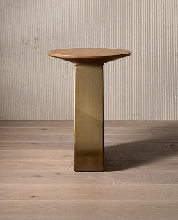 A sculptural side table with an oak top and brass base.